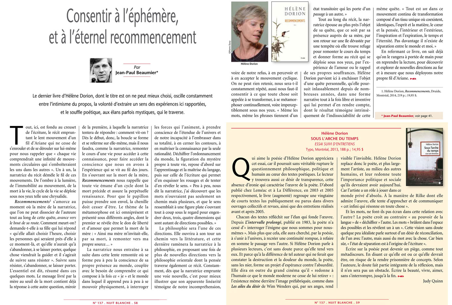 « Prose et poésie sont deux pièces d’une maison pour l’écrivaine qui continue ainsi de se construire, de se renouveler. Hélène Dorion flotte. Ni loin ni au-dessus de nous mais tout autour. Elle nous chuchote qu’elle fait le voyage vers soi. »